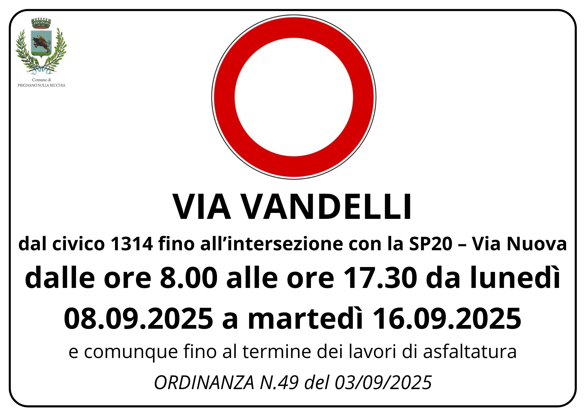 Si avvisa la cittadinanza che per consentire le lavorazioni di asfaltatura a seguito della posa della nuova rete gas da parte di InRete Distribuzione Energia spa, con ordinanza n.49 del 03/09/2025, è stato disposto il divieto di transito in Via Vandelli dal civico 1314 fino all’intersezione con la SP20 – Via Nuova, nei giorni feriali dalle ore 8.00 alle ore 17.30, nel periodo compreso dal 08.09.2025 al 16.09.2025 e comunque fino al termine delle lavorazioni.