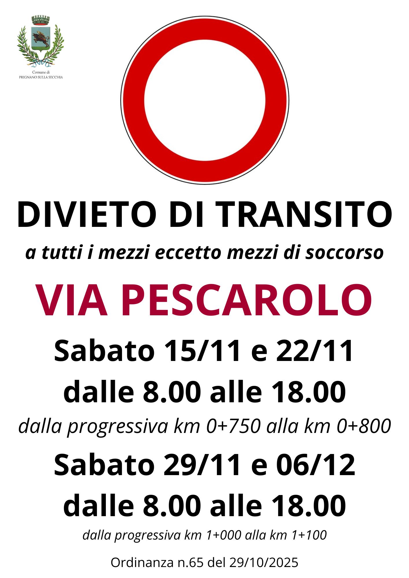 - Sabato 15 novembre 2025 – dalle ore 8.00 alle ore 18.00, dalla progressiva km 0+750 alla km 0+800