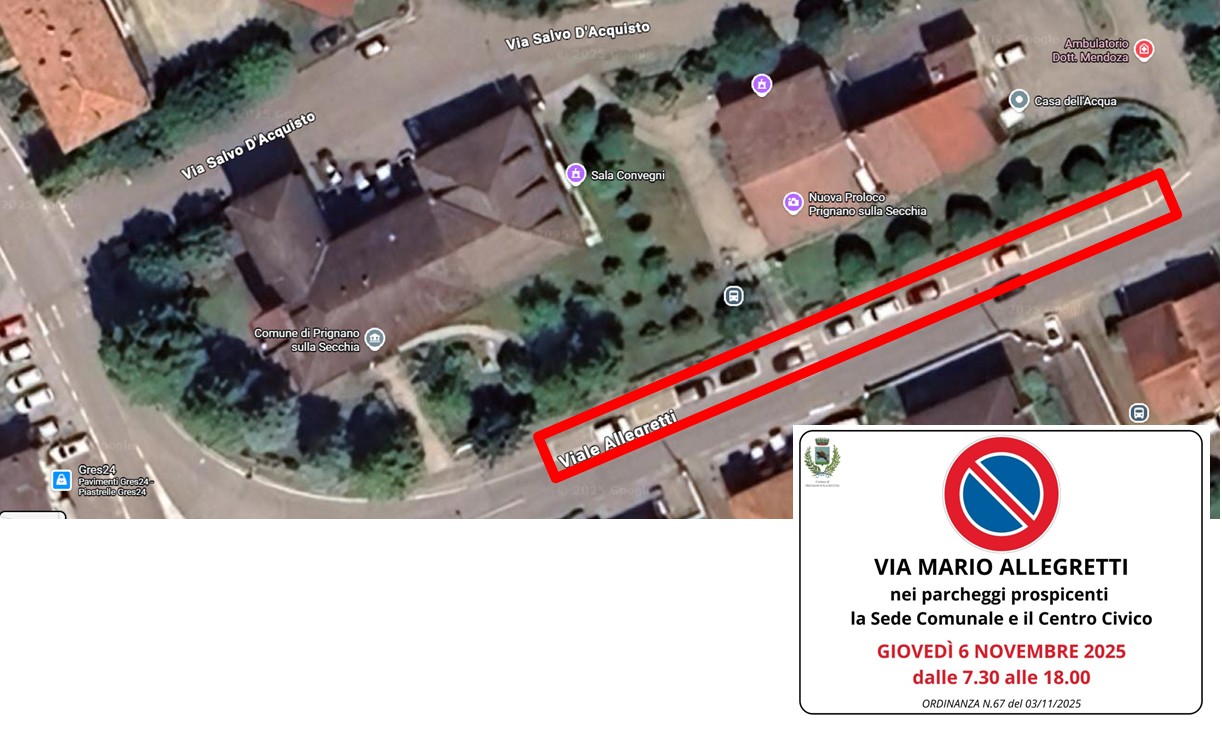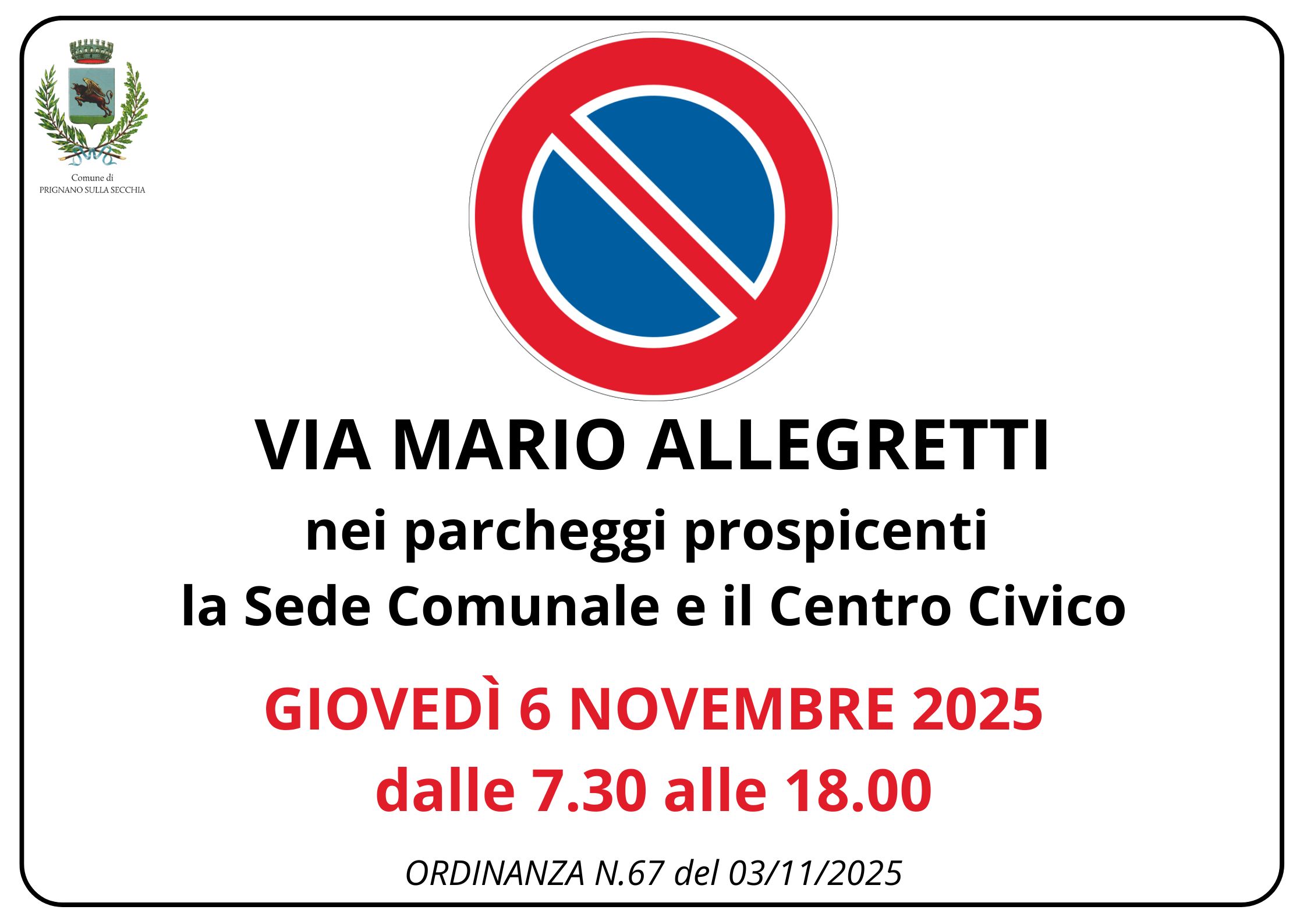 Si informa la cittadinanza che, per consentire la potatura della siepe e le attività di pulizia nelle aree adiacenti la Sede Municipale e il Centro Civico, con ordinanza n.67 del 03-11-2025 è stato disposto un divieto di sosta temporaneo lungo Via Mario Allegretti.