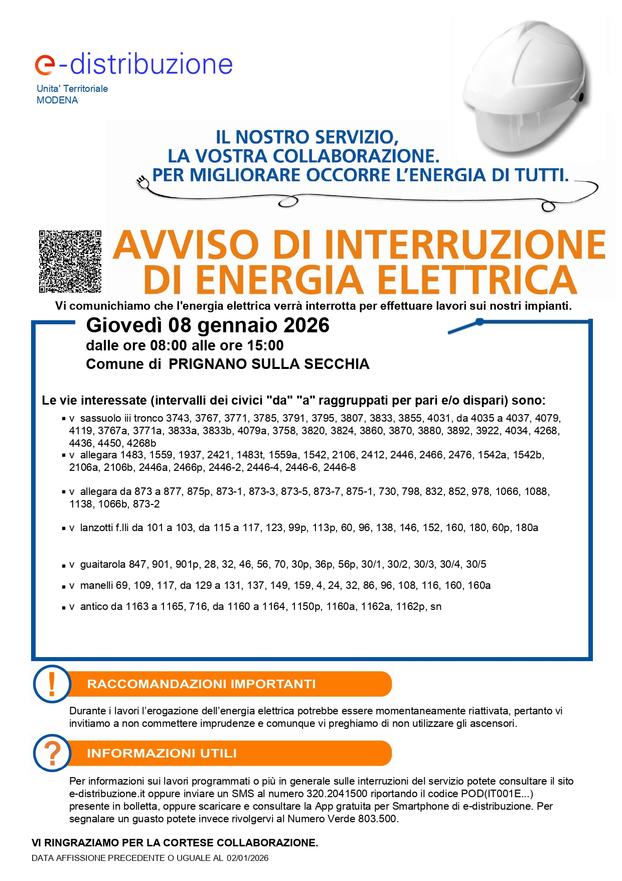 Si informa la cittadinanza che E-Distribuzione ha comunicato che, a causa di interventi legati all'installazione della fibra ottica, sarà necessaria l'interruzione di energia elettrica il giorno 08 gennaio dalle ore 8.00 alle ore 15:00 per permettere agli operatori di potere lavorare in sicurezza.