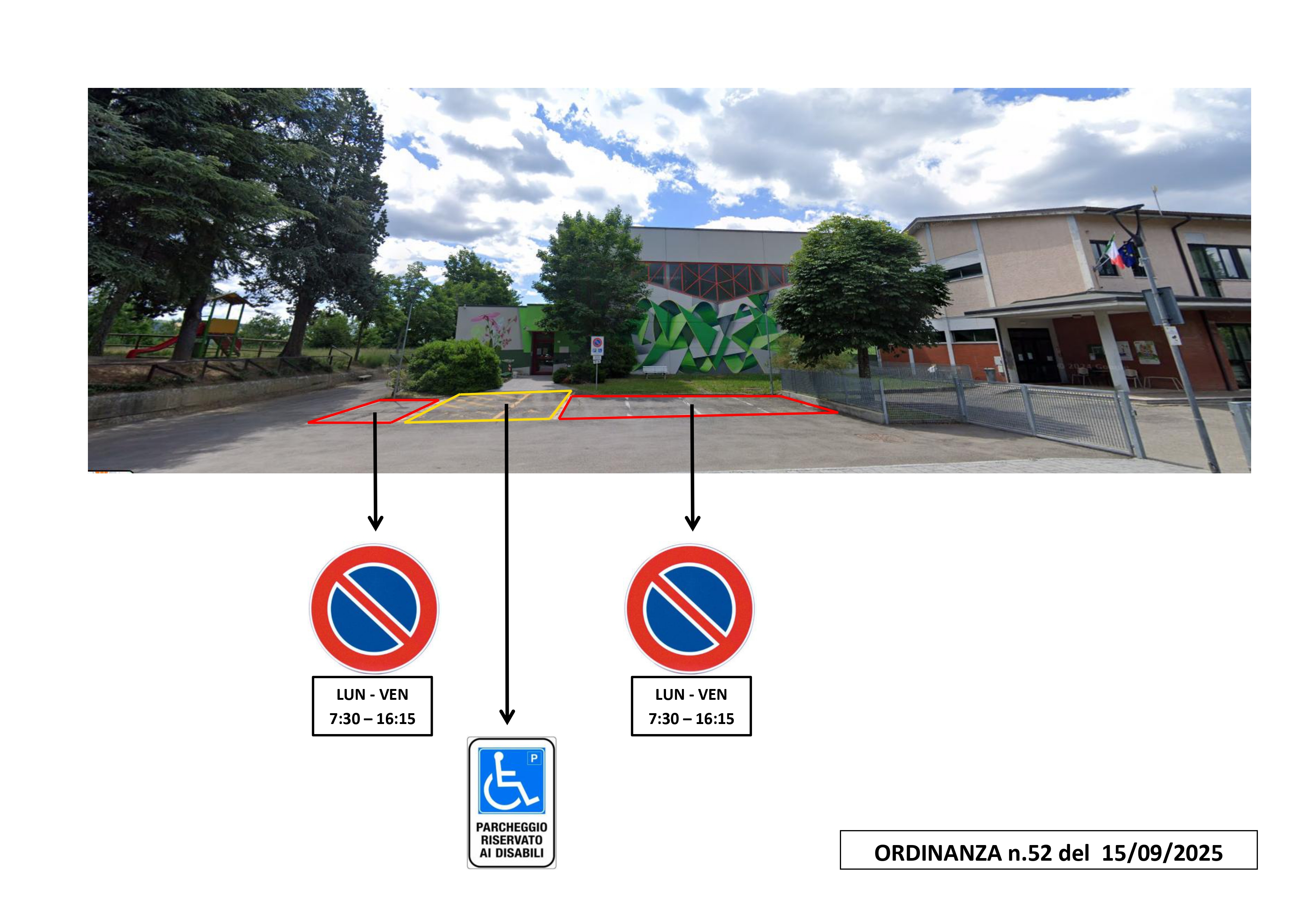 - Divieto di sosta, dal lunedì al venerdì dalle ore 7.30 alle ore 16.15, nei parcheggi antistanti l’accesso alla scuola secondaria e alla palestra, fatta eccezione per i posteggi riservati alle persone con disabilità munite di apposito contrassegno.