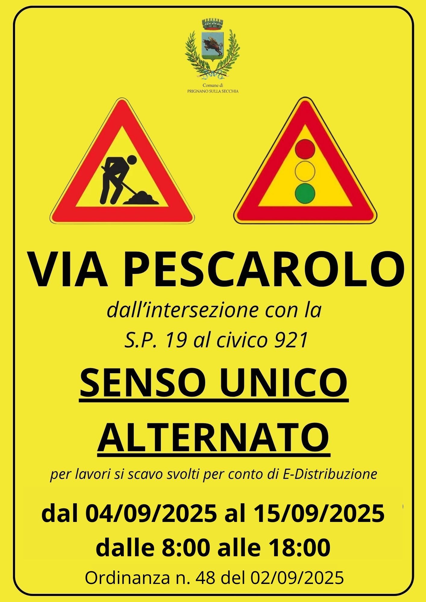 Si avvisa la cittadinanza che, con Ordinanza n. 48 del 02/09/2025, è stata disposta l’istituzione temporanea di senso unico alternato in Via Pescarolo, nel tratto compreso tra l’intersezione con la SP19 e il civico 921, da da giovedì 04.09.2025 a lunedì 15.09.2025 dalle 8.00 alle 18.00.