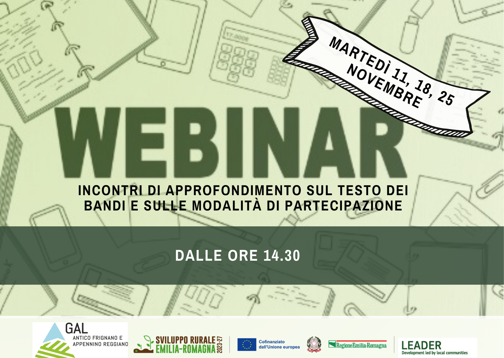 Sono aperte le iscrizioni ai prossimi appuntamenti organizzati in modalita' webinar dal GAL Antico Frignano e Appennino reggiano per approfondire i contenuti e le modalita' di partecipazione dei bandi attualmente disponibili.